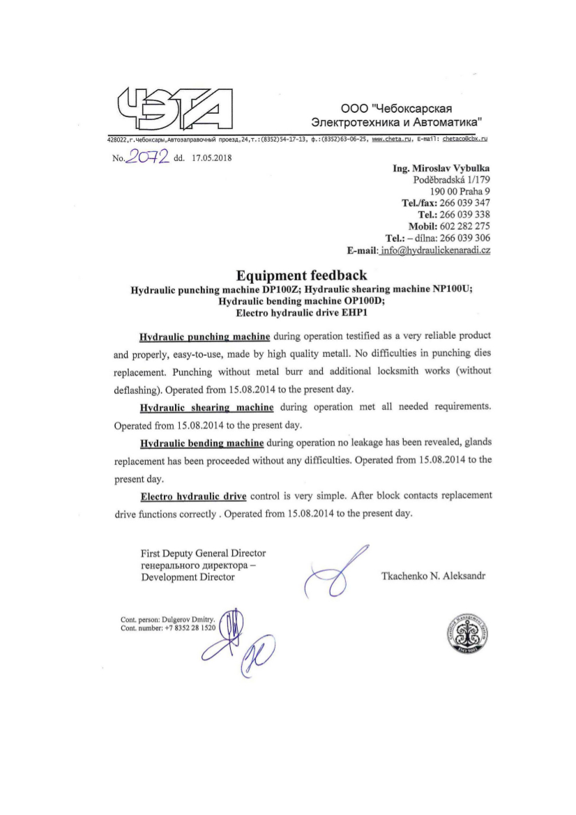 Děkuji firmě Ing. Miroslav Vybulka – hydraulické nářadí za skvělý přístup, vstřícnost a profesionalitu. Jsme firma zaměřená na rekonstrukce rozvoden VN, poskytujeme pohotovostní službu na EZ, tudíž prakticky pořád potřebujeme strojní vybavení od Vaší firmy. Pomocí vašeho montážního nářadí pro práci s pasovinou jsme zvládli ostře sledovanou zakázku ve velice krátké době a ve vysoké kvalitě. . Ve firmě Ing. Miroslav Vybulka – hydraulické nářadí máme skvěleho partnera a těšíme se na další spolupráci.